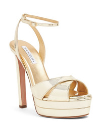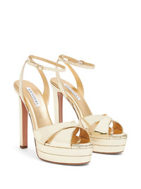 Divine Plateau 130mm platform sandals Made from gold-tone calf leather, these AQUAZZURA Divine Plateau sandals feature elegant crossover straps around the toe. The 130mm heel is balanced with a platform sole. Highlights - Gold-tone - Calf leather - Metallic finish - Open toe - Crossover strap at the toe - Buckle-fastening ankle strap - Branded insole - Platform sole - High 130mm heel Made in Italy Composition Outer: Patent Leather 100% Lining: Calf Leather 100% Sole: Calf Leather 100% SIZE & FIT Measurement HEEL 5.11 in(13 cm)