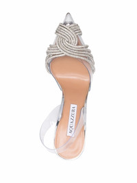 Gatsby 105mm sandals These Gatsby Sling pumps from Aquazurra are elegantly presented in a mix of transparent PVC, leather and crystal embellishments. Offering more coverage with a pointed-toe masquerading as open-toe, the pair are finished with a stiletto heel. Made in Italy Composition PVC 100% SIZE & FIT Measurement HEEL 4.13 in(10.5 cm)