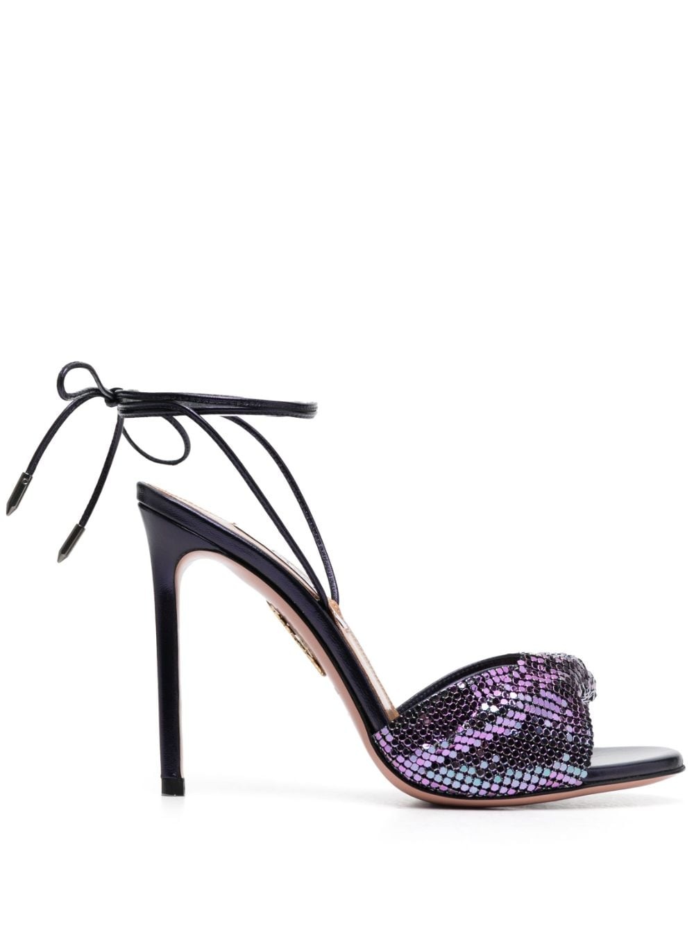 lace-up 110 mesh sandals Spotlighting Aquazzura's love for glamorous details, these sandals are covered with a metallic mesh that changes colours according to the light. Resting atop 110mm stiletto heels, the pair is fastened with a delicate lace-up ankle strap. Highlights - Grape purple - Calf leather - Mesh detailing - Tie-fastening ankle strap - Open toe - Branded leather insole - High stiletto heel Made in Italy Composition Lining: Lamb Skin 100% Sole: Calf Leather 100% Outer: Calf Leather 100% SIZE & FIT Measurement HEEL 4.33 in(11 cm)