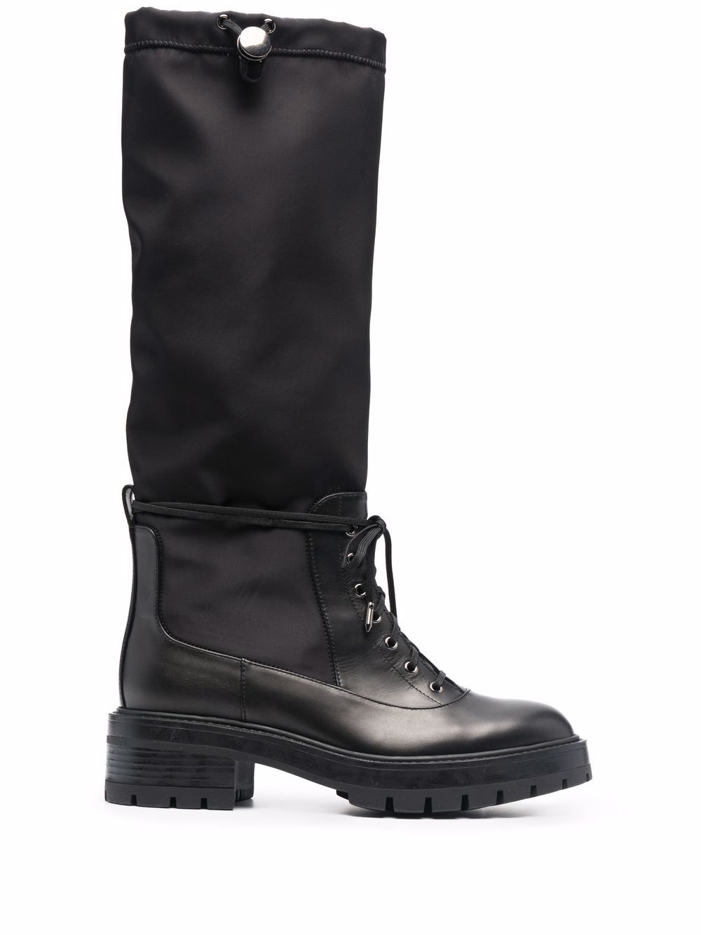 lace-up detail boots black leather knee-length drawstring fastening front lace-up fastening round toe low ridged heel Made in Italy Composition Sole: Rubber 100% Top: Calf Leather 52%, Polyamide 48% Lining: Nappa Leather 100% SIZE & FIT Measurement HEEL 1.96 in(5 cm) HEIGHT 15.74 in(40 cm) PLATFORM 1.18 in(3 cm)