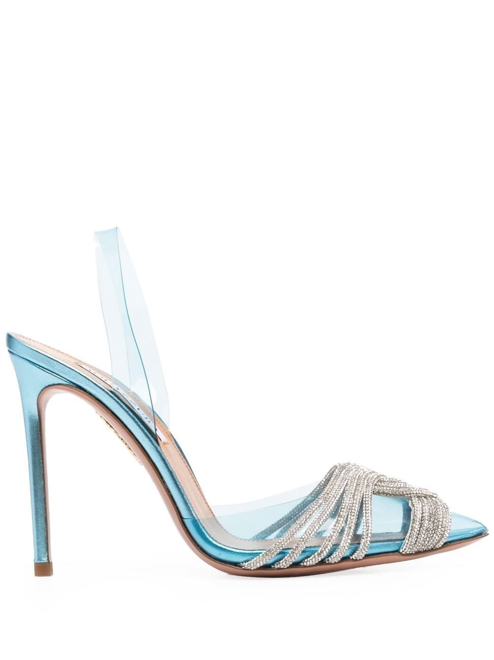 rhinestone-embellished sling-back stilettos Proving that the 2000s are definitely back, these AQUAZZURA sling-back stilettos show the iconic transparent construction so popular back in the day. Embellishing the vamp all the way to the pointed toe, there’s a rhinestone-embellished piece. Made in Italy Composition PVC 100% SIZE & FIT Measurement HEEL 4.52 in(11.5 cm) Sole height 0.39 in(1 cm)