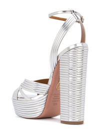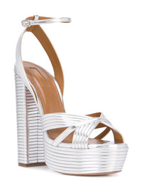 140mm Sundance Plateau sandals Combining the European and modern America aesthetic, Aquazzura is all about classic silhouettes boasted with modern sophistication. Highlights - Silver-tone - Leather - Open toe - Branded insole - Buckle-fastening ankle strap - High block heel - Platform sole Made in Italy Composition Other fibres 100% SIZE & FIT Measurement Sole height 0.03 in(0.1 cm) HEEL 5.9 in(15 cm) PLATFORM 1.49 in(3.8 cm) Washing instructions Specialist Cleaning