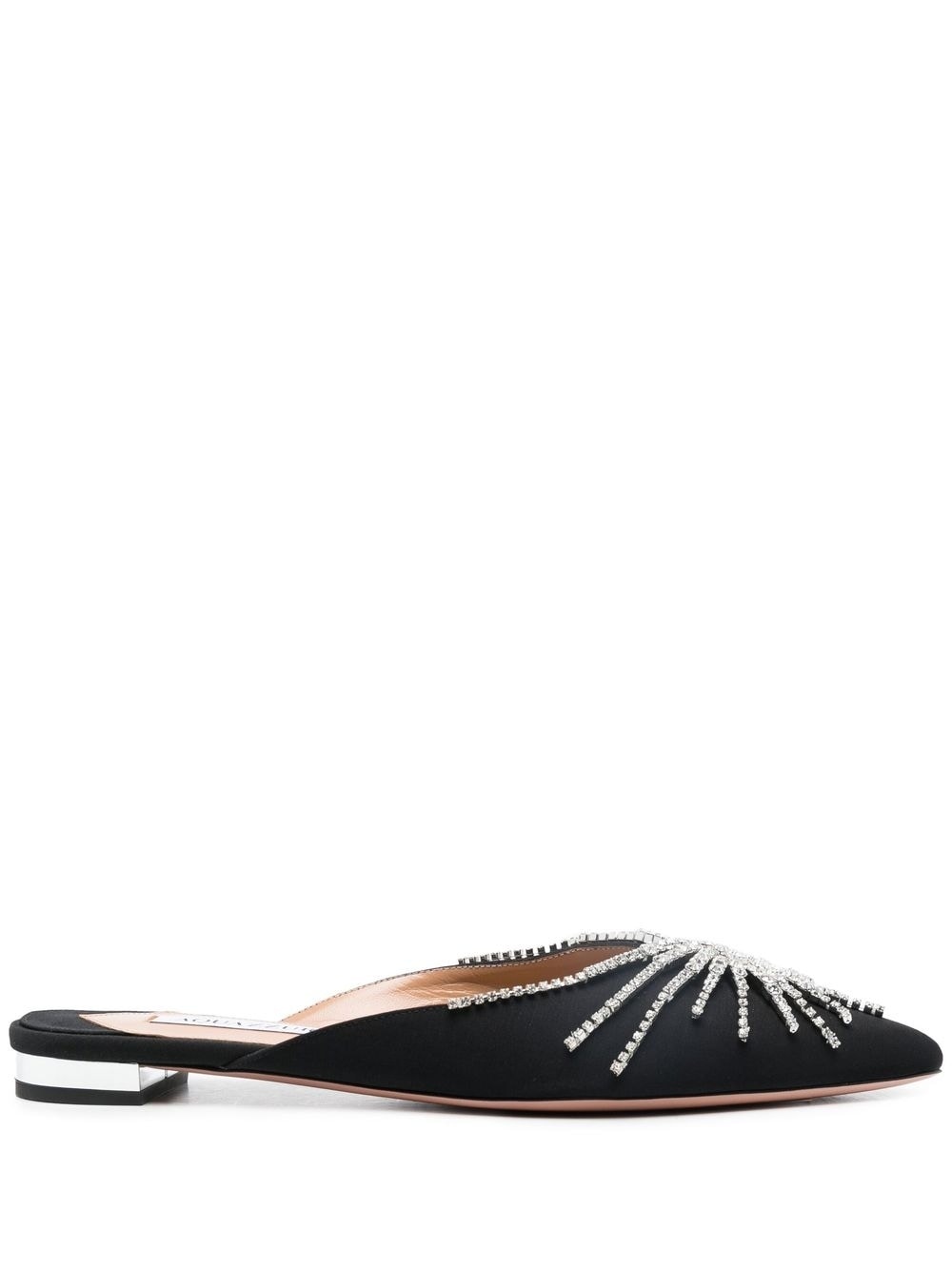 Sunshine crystal-embellished flat mules black calf leather goatskin crystal embellishment pointed toe branded insole flat sole Made in Italy Composition Sole: CALFSKIN 100% Lining: Goat Skin 100% Outer: Crystal 100%, Viscose 100% SIZE & FIT Measurement HEEL 0.78 in(2 cm)
