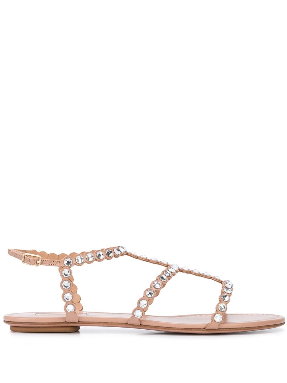 Tequila crystal-embellished sandals Beige leather Tequila crystal-embellished sandals from Aquazzura featuring an open toe, a T-bar strap, an ankle strap with a side buckle fastening, a branded insole and a flat heel. Made in Italy Composition Nappa Leather 100% SIZE & FIT Measurement CIRCUMFERENCE 10.23 in(26 cm) HEEL 0.19 in(0.5 cm) HEIGHT 2.75 in(7 cm) Sole height 0.39 in(1 cm) WIDTH 3.54 in(9 cm)