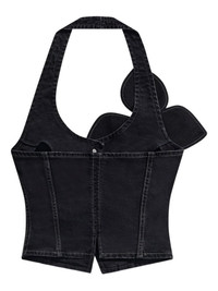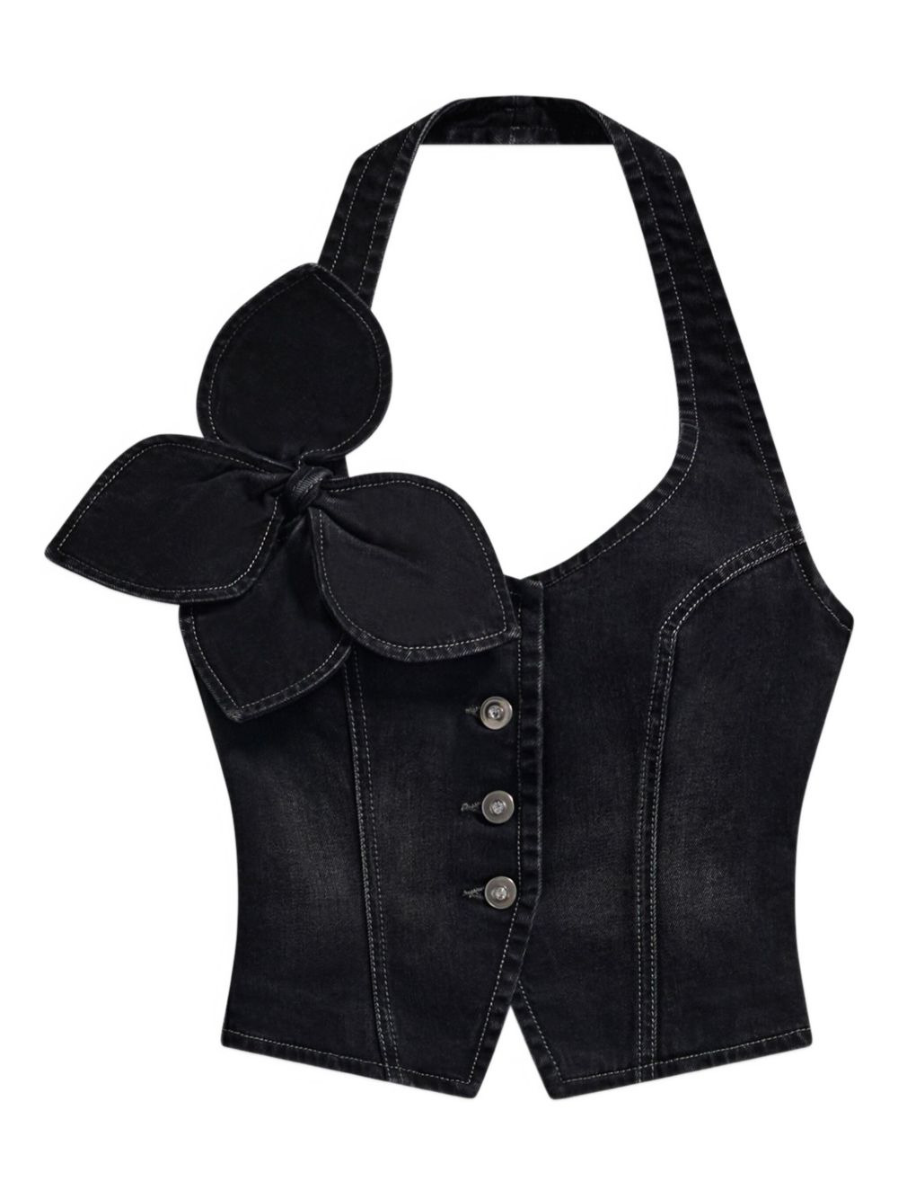 bow denim halter top Highlights - Washed black - Bow detail - Button fastening - Halterneck - Sleeveless - Denim texture Made in Italy Composition Cotton 98%, Elastane 2% Washing instructions Dry Clean Only