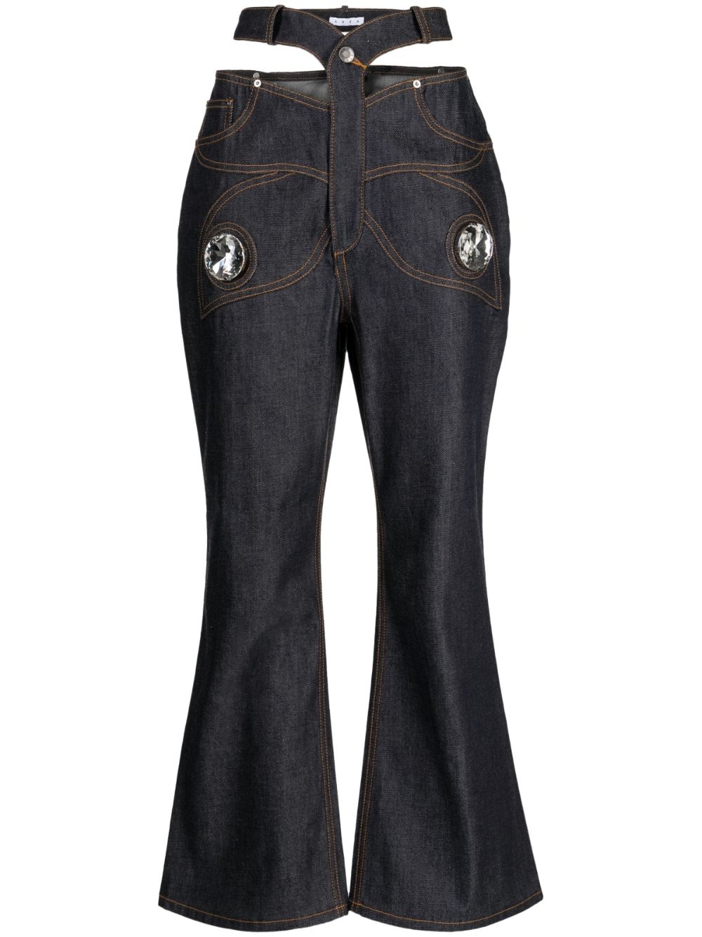 Butterfly cut-out flared jeans Inspired by butterfly wings, these flared jeans by AREA boast contrast stitching and sharp cut-outs that sculpt the silhouette. Crafted from pure cotton, they sit high on the waist and are embellished with big crystals for shimming finish. Highlights - Indigo blue - Cotton - Denim - Contrast stitching - High waist - Cut-out detailing - Belt loops - Front button fastening - Two side inset pockets - Rear patch pocket - Flared Imported Composition Cotton 100% SIZE & FIT Model measurements Height 5 ft 10 in(1.77 m) Bust/Chest 31.49 in(80 cm) Hips 35.43 in(90 cm) Waist 25.19 in(64 cm) FittingInformation Designed with a flared hem, these jeans allow for a close fit at the waist with a slim fit over the leg and widening towards the hem Cropped in length Sturdy and hard-wearing, this denim piece offers no stretch This piece fits true to size – take your usual size Washing instructions Dry Clean Only