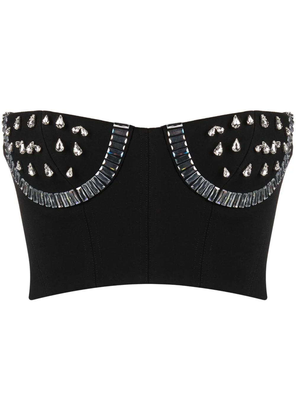 crystal-embellished bustier top AREA's affinity for scintillating embellishment takes centre stage for SS23, as evidenced by this black bustier top. The boned bodice is artfully decorated with light-catching crystals that trace the underwired cups, emphasising the opulent mood. Highlights - Black - Strapless - Crystal embellishment - Cropped - Rear zip fastening Imported Composition Rayon 67%, Nylon 28%, Elastane 5% SIZE & FIT Model measurements Height 5 ft 10 in(1.78 m) Bust/Chest 31.49 in(80 cm) Hips 35.03 in(89 cm) Waist 23.62 in(60 cm) FittingInformation Designed for a very close and sculpting fit Made from a midweight stretch fabric, this piece offers elasticity and flexibility when worn This piece fits true to size – take your usual size Washing instructions Dry Clean Only