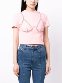 crystal-embellished cup-chain T-shirt Highlights - Rose pink - Crystal embellishment - Cup chain - Crew neck - Short sleeves - Ribbed cuffs - Straight hem Made in United States Composition Rayon 67%, Nylon 28%, Spandex/Elastane 5% SIZE & FIT Model measurements Height 5 ft 10 in(1.77 m) Bust/Chest 28.74 in(73 cm) Hips 35.82 in(91 cm) Waist 24.4 in(62 cm) Measurement CHEST 28.34 in(72 cm) LENGTH 16.92 in(43 cm) WAIST 25.19 in(64 cm) FittingInformation Designed for a slim fit that sits just away from the body offering a close yet comfortable fit Constructed with a narrow neckline Made from a midweight stretch fabric, this piece offers elasticity and flexibility when worn This piece fits true to size – those with broad shoulders may wish to take one size up Washing instructions Dry Clean Only