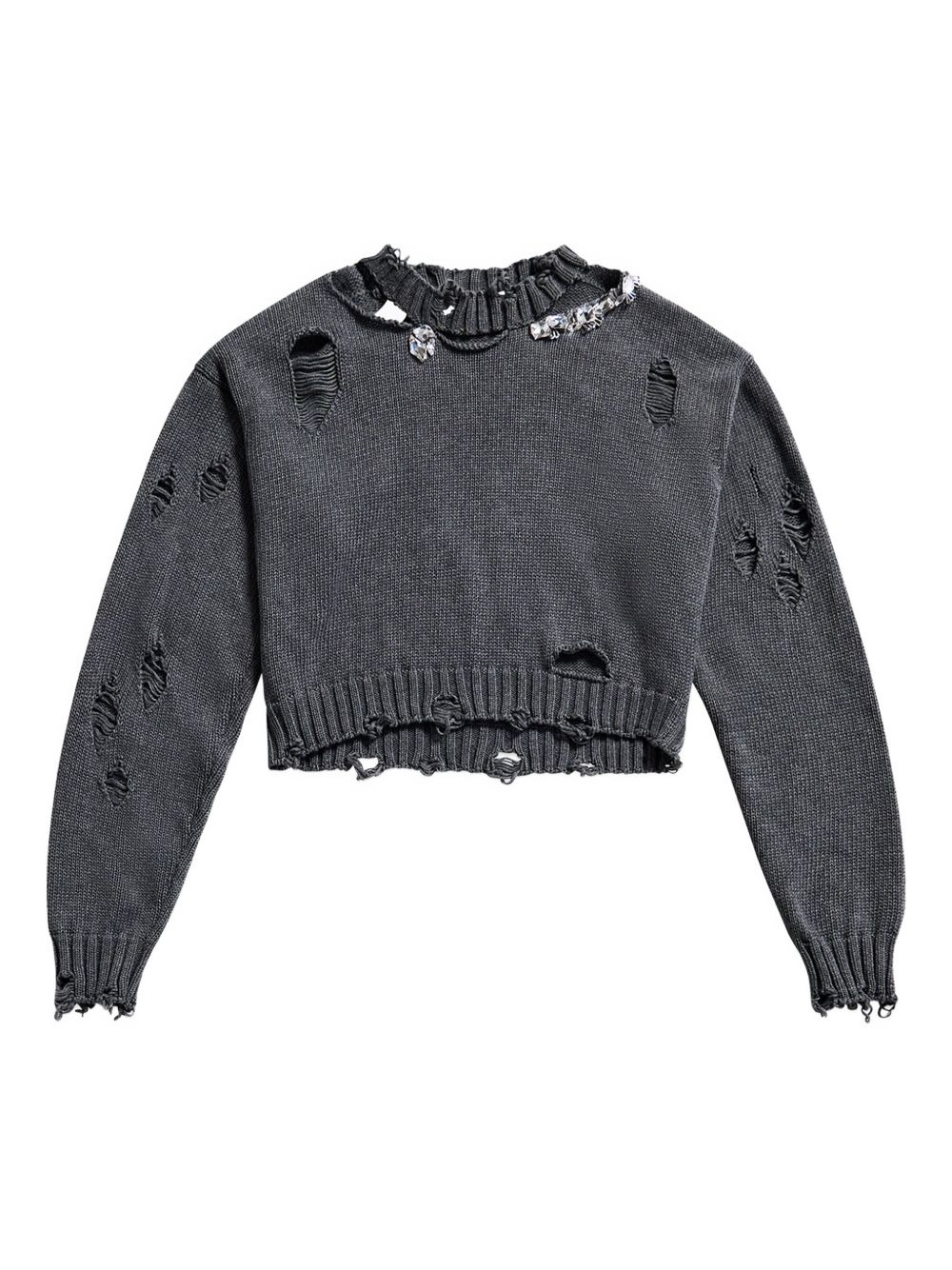 crystal-embellished distressed sweater Highlights - Heathered grey - Crystal embellishments - Distressed detailing - Crew neck - Long sleeves - Ribbed hem Made in Italy Composition Organic Cotton 90%, Cashmere 10% Washing instructions Read Manufacturer Guidelines