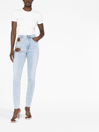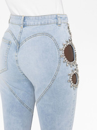 crystal-embellished jeans These Area jeans spotlight the brand's ability to elevate simple designs with striking detailing. Their light-wash denim construction is disrupted by rounded cut-outs trimmed with glistening crystals. A heart-shaped seam decorates the back for an added dose of playfulness. Highlights - Light blue - Denim - Stretch-cotton - Cut-out detailing - Crystal embellishment - High waist - Front button and zip fastening Imported Composition Outer: Cotton 97%, Spandex/Elastane 3% Lining: Polyester 65%, Cotton 35% SIZE & FIT Model measurements Height 5 ft 10 in(1.77 m) Bust/Chest 32.28 in(82 cm) Hips 35.03 in(89 cm) Waist 25.19 in(64 cm) Measurement FRONT RISE 10.62 in(27 cm) HIPS 35.43 in(90 cm) WAIST 26.77 in(68 cm) FittingInformation Designed for a skinny fit, these jeans offer a close fit throughout Constructed from stretch denim, this piece offers a stretch fit with durability This piece fits true to size – take your usual size