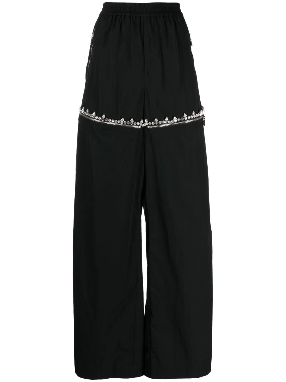 crystal-embellished wide-leg trousers Highlights - Black - Crystal embellishment - Wide leg - Elasticated waistband - Two side zip-fastening pockets - Front zip fastening at the thighs Imported Composition Nylon 100% SIZE & FIT Model measurements Height 5 ft 10 in(1.77 m) Bust/Chest 31.49 in(80 cm) Hips 35.43 in(90 cm) Waist 25.19 in(64 cm) FittingInformation Designed with a wide-leg cut, these trousers allow for a close fit at the waist and offer a loose and roomy fit over the leg The elasticated waist allows for a comfortable fit Made from a midweight non-stretch fabric This piece fits true to size – take your usual size Washing instructions Dry Clean Only