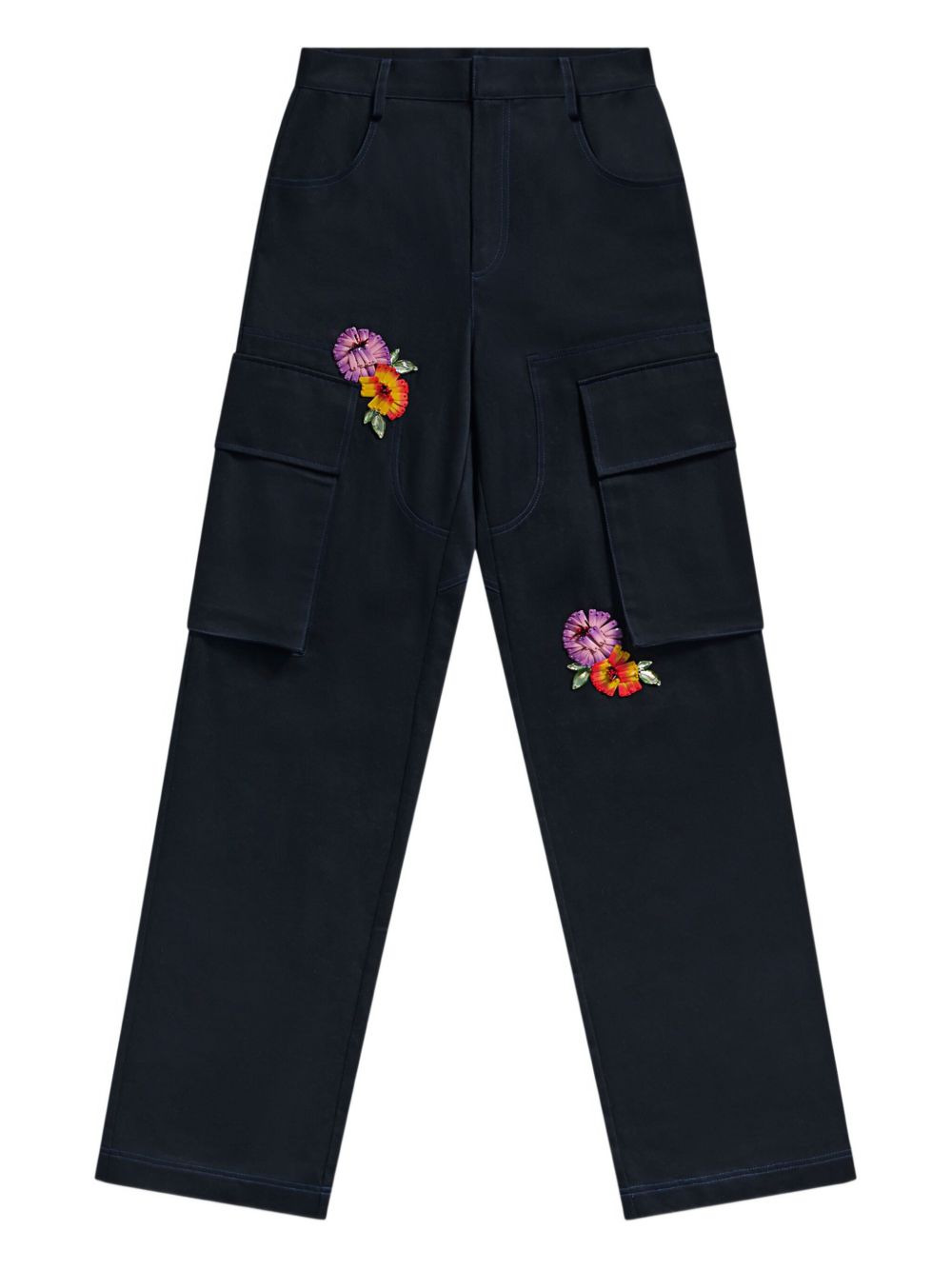 embroidered-flower cargo trousers Highlights - Midnight blue - Flower embroidery - Cargo pockets - Heart detail to the rear - Tonal stitching - Belt loops Imported Composition Cotton 100%