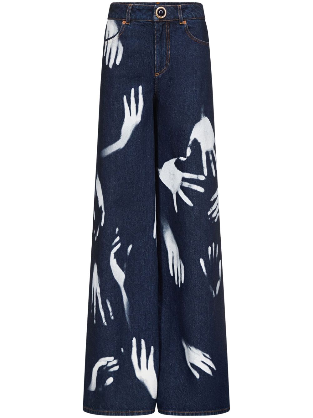 Hand-print wide-leg jeans Highlights - Navy blue - Cotton - Dark wash - All-over graphic print - Wide leg - Concealed fly and button fastening - Belt loops - Gemstone detailing - Two side patch pockets - Decorative stitching - Two rear patch pockets Made in Italy Composition Cotton 100%