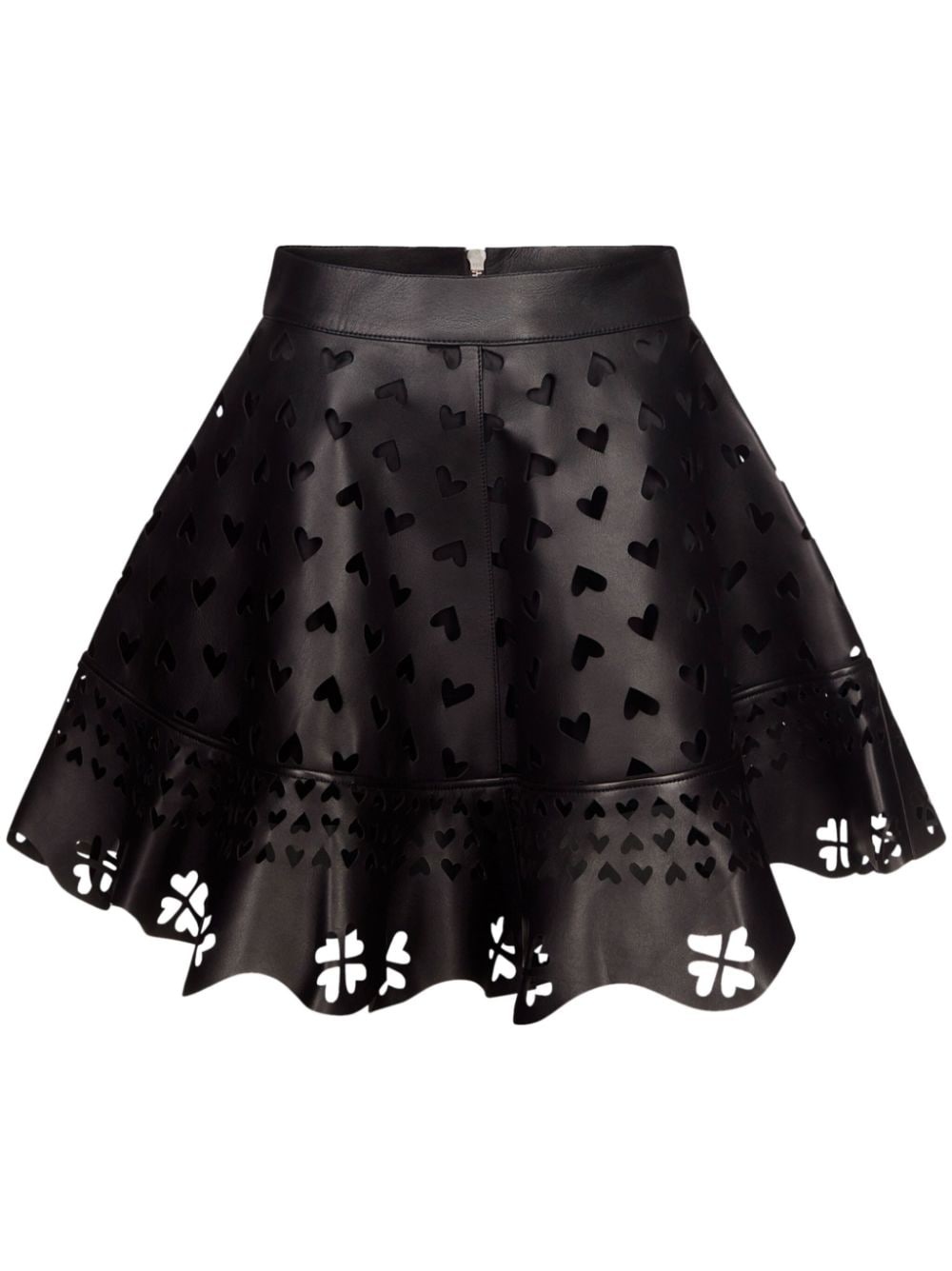 laser-cut leather miniskirt Highlights - Black - Lambskin - Smooth grain - Layered design - Laser-cut detail - Heart motif - High-waisted - Rear zip fastening - Flared - Thigh-length - Scallop hem Made in Italy Composition Lamb Skin 100% Washing instructions Read Manufacturer Guidelines