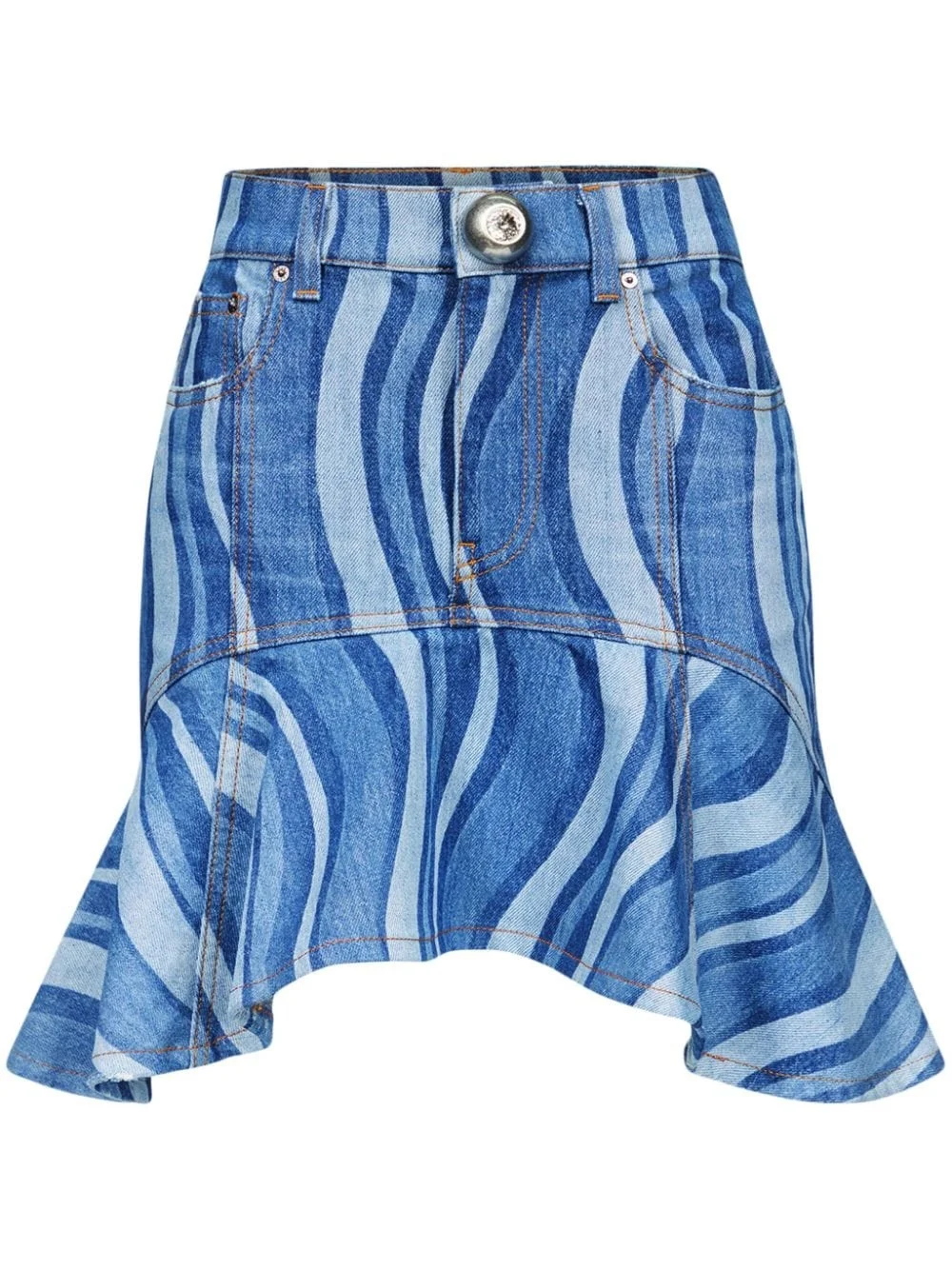 Sunray ruffle-hem denim skirt Highlights - Light blue/dark blue - Cotton - Denim - Ruffle hem - Belt loops - Front button and zip fastening - Contrast stitching - Two side inset pockets - Thigh-length Made in Italy Composition Cotton 100% SIZE & FIT Measurement HIPS 35.98 in(91.4 cm) LENGTH 16.49 in(41.9 cm) WAIST 25.98 in(66 cm) Washing instructions Dry Clean Only