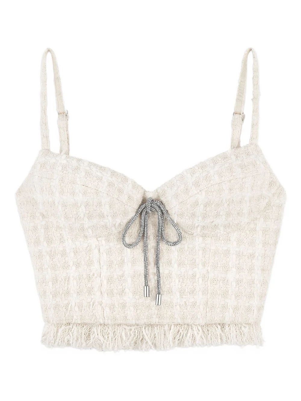tweed-texture top Highlights - Cream white - Tweed texture - Adjustable shoulder straps - Tie detail - Tassel trim Imported Composition Polyester 70%, Wool 30% Washing instructions Dry Clean Only