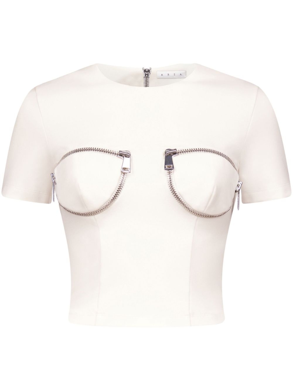 zipper bustier cup T-shirt Highlights - White - Rear zip fastening - Crystal embellishment - Crew neck - Sheer sleeves Imported Composition Cotton 95%, Elastane 5% Washing instructions Dry Clean Only