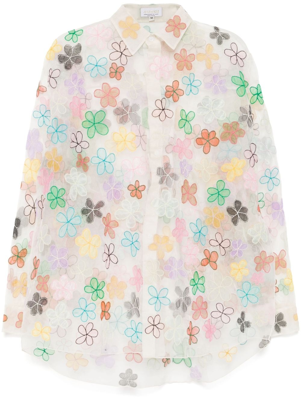 silk shirt Highlights - White/multicolour - Front button fastening - Embroidered design - Semi-sheer construction Imported Composition Silk 100% SIZE & FIT Model measurements Height 5 ft 10 in(1.77 m) Bust/Chest 31.49 in(80 cm) Hips 35.43 in(90 cm) Waist 25.19 in(64 cm) FittingInformation Designed to be unstructured, offering a loose fit throughout Made from a midweight non-stretch fabric