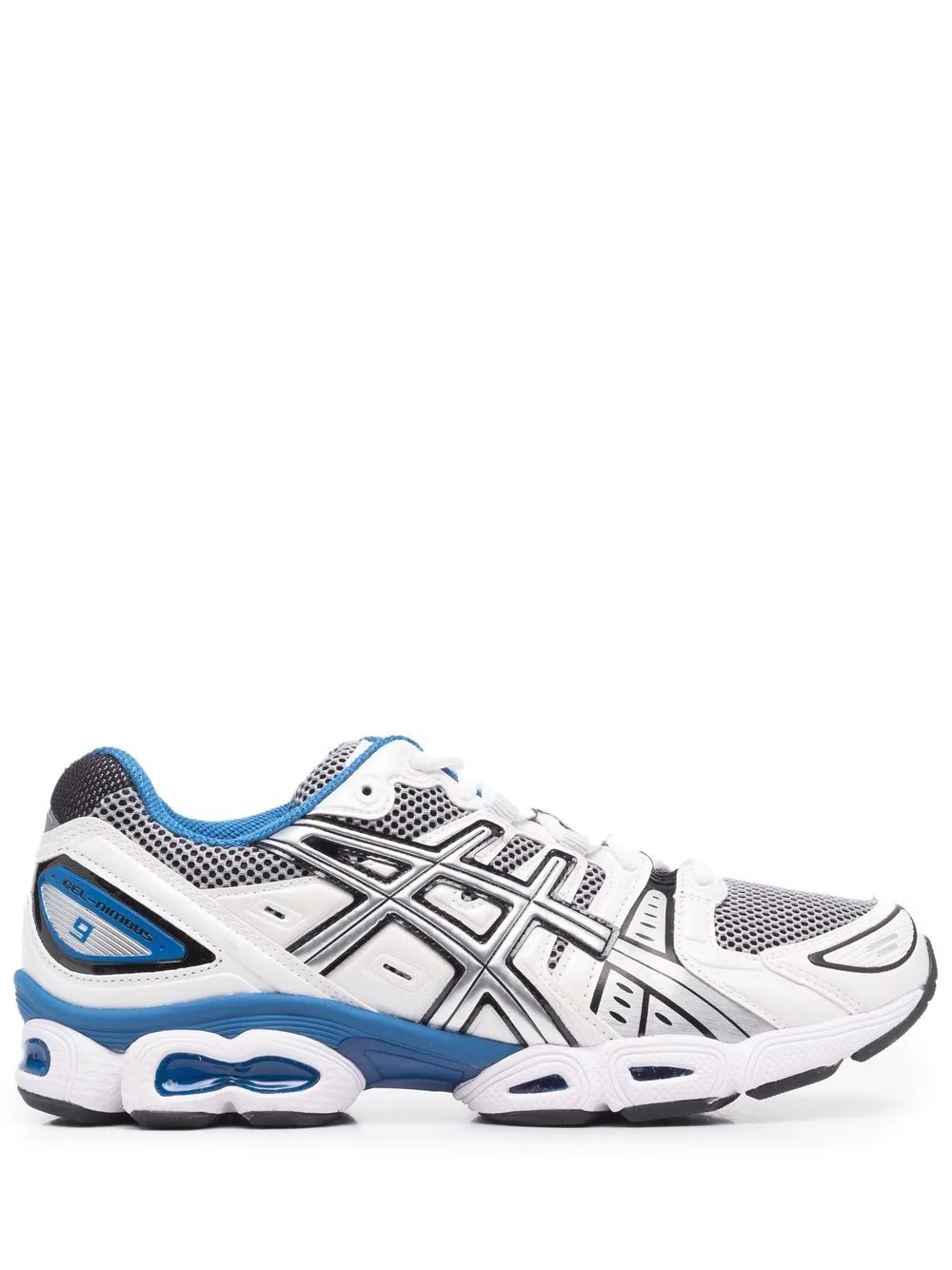 Gel-Nimbus 9 low top sneakers Highlights - White - Blue - Colour-block panelled design - Mesh panelling - Front lace-up fastening - Round toe - Flat rubber sole - Branded insole Imported Composition Lining: Fabric 100% Sole: Rubber 100% Outer: Mesh 100%, Artificial Leather 100% SIZE & FIT Measurement HEEL 1.18 in(3 cm) Sole height 0.59 in(1.5 cm) FittingInformation This piece fits small – take one size up