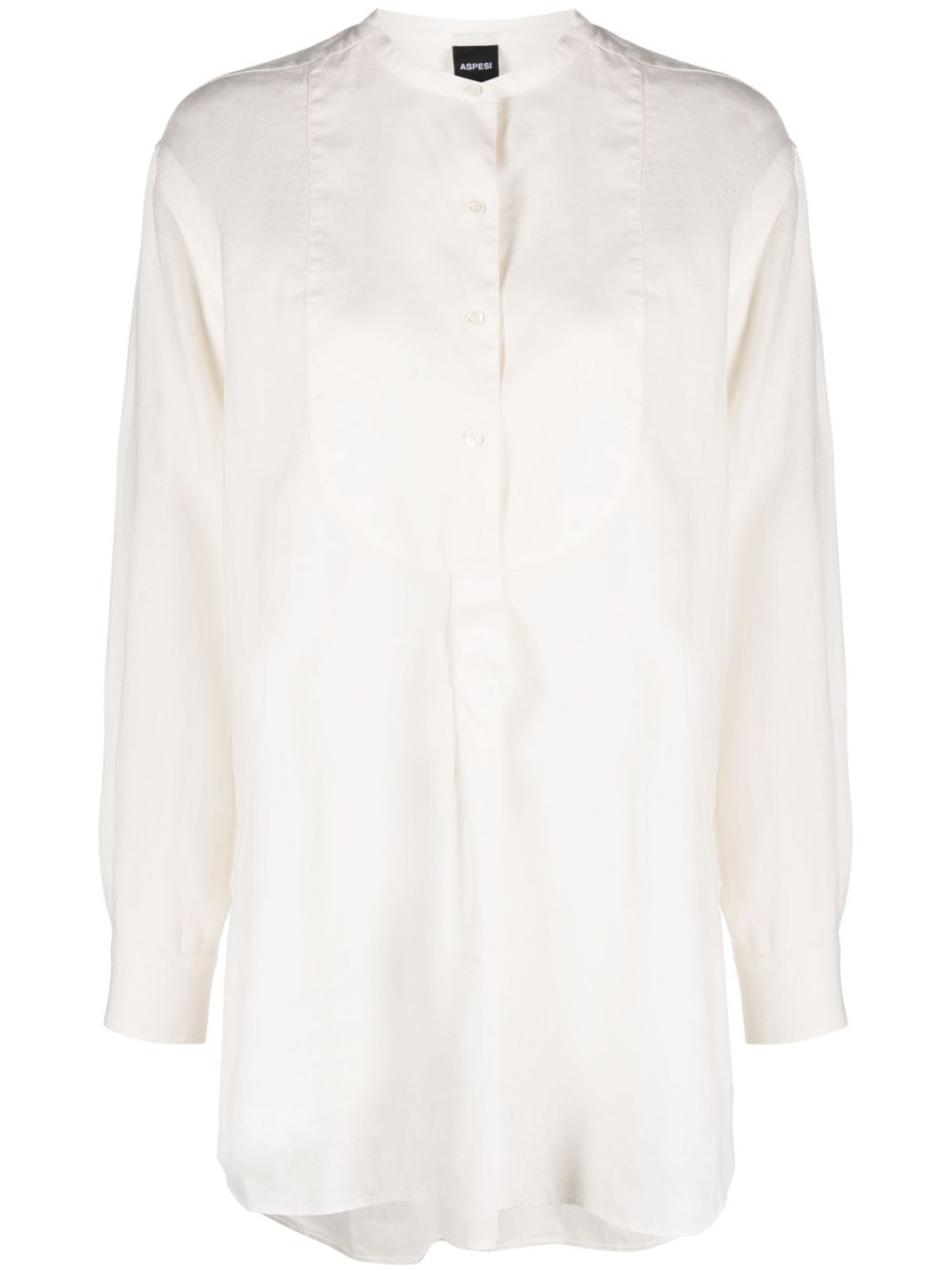 collarless linen bib shirt Minimal through and through, this white shirt from Aspesi is cut from breathable linen in a longline silhouette. It has a bib panel, slightly dropped shoulders and curved longline hem that dips lower at the back. Highlights - Light beige - Linen/flax - Panelled design - Collarless - Front button fastening - Long sleeves - Buttoned cuffs - High-low hem Made in Italy Composition Linen/Flax 100% SIZE & FIT Model measurements Height 5 ft 10 in(1.79 m) Bust/Chest 31.1 in(79 cm) Hips 35.03 in(89 cm) Waist 24.01 in(61 cm) FittingInformation Designed to be unstructured, offering a loose fit throughout Made from a lightweight non-stretch fabric This piece fits true to size – take your usual size Washing instructions Machine Wash