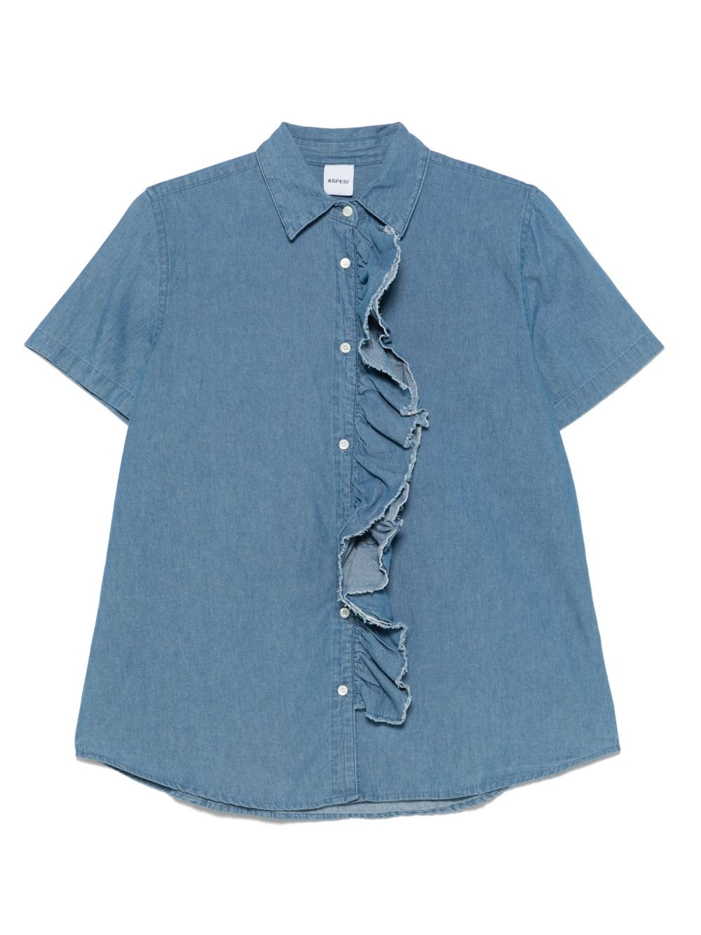 denim shirt Highlights - Imperial blue - Front button fastening - Box-pleat detail - Ruffled detailing - Short sleeves Imported Composition Cotton 100%