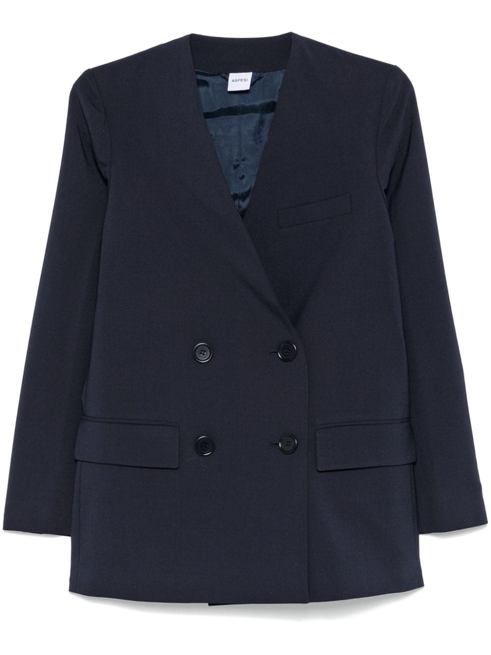 double-breasted blazer Highlights - Navy blue - Tailored design - Double-breasted button fastening - No lapels - Long sleeves with buttoned cuffs - Chest welt pocket - Two front flap pockets - American rear vent - Full lining - Straight hem Made in Italy Composition Outer: Polyester 53%, Virgin Wool 43%, Elastane 4% Lining: Viscose 100% SIZE & FIT Model measurements Height 5 ft 11 in(1.8 m) Bust/Chest 31.49 in(80 cm) Hips 36.61 in(93 cm) Waist 24.4 in(62 cm) FittingInformation Designed for a slim fit that sits just away from the body offering a close yet comfortable fit The vented hem offers movement at the rear Made from a midweight non-stretch fabric Washing instructions Dry Clean Only