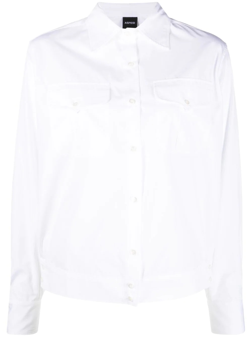 long-sleeved cotton shirt white cotton two front flap pockets front button fastening classic collar long sleeves buttoned cuffs straight hem Imported Composition Cotton 100% SIZE & FIT Model measurements Height 5 ft 10 in(1.77 m) Bust/Chest 35.03 in(89 cm) Hips 35.03 in(89 cm) Waist 23.62 in(60 cm) FittingInformation This piece fits true to size. We recommend you get your regular size Cut for a loose fit Made with a mid-weight non-stretch fabric Washing instructions Machine Wash