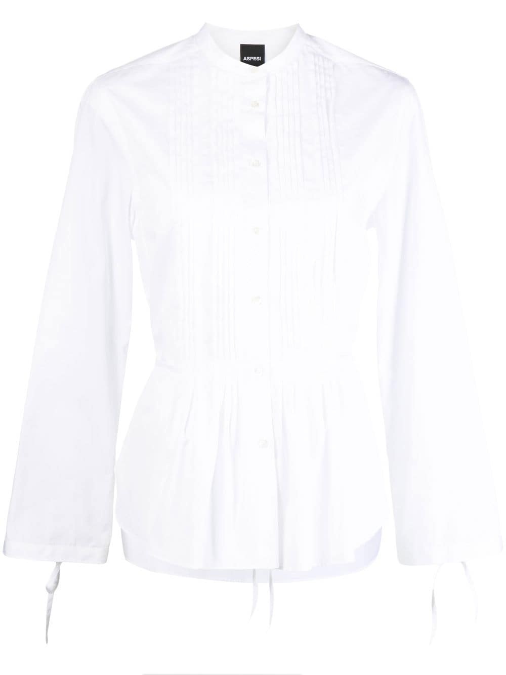 peplum button-up shirt white cotton pleat detailing collarless front button fastening long sleeves peplum hem Made in Italy Composition Outer: Cotton 100% SIZE & FIT Model measurements Height 5 ft 9 in(1.76 m) Bust/Chest 31.1 in(79 cm) Hips 35.03 in(89 cm) Waist 24.4 in(62 cm) FittingInformation This piece fits true to size. We recommend you get your regular size Cut for a loose fit Made with a mid-weight non-stretch fabric Washing instructions Machine Wash