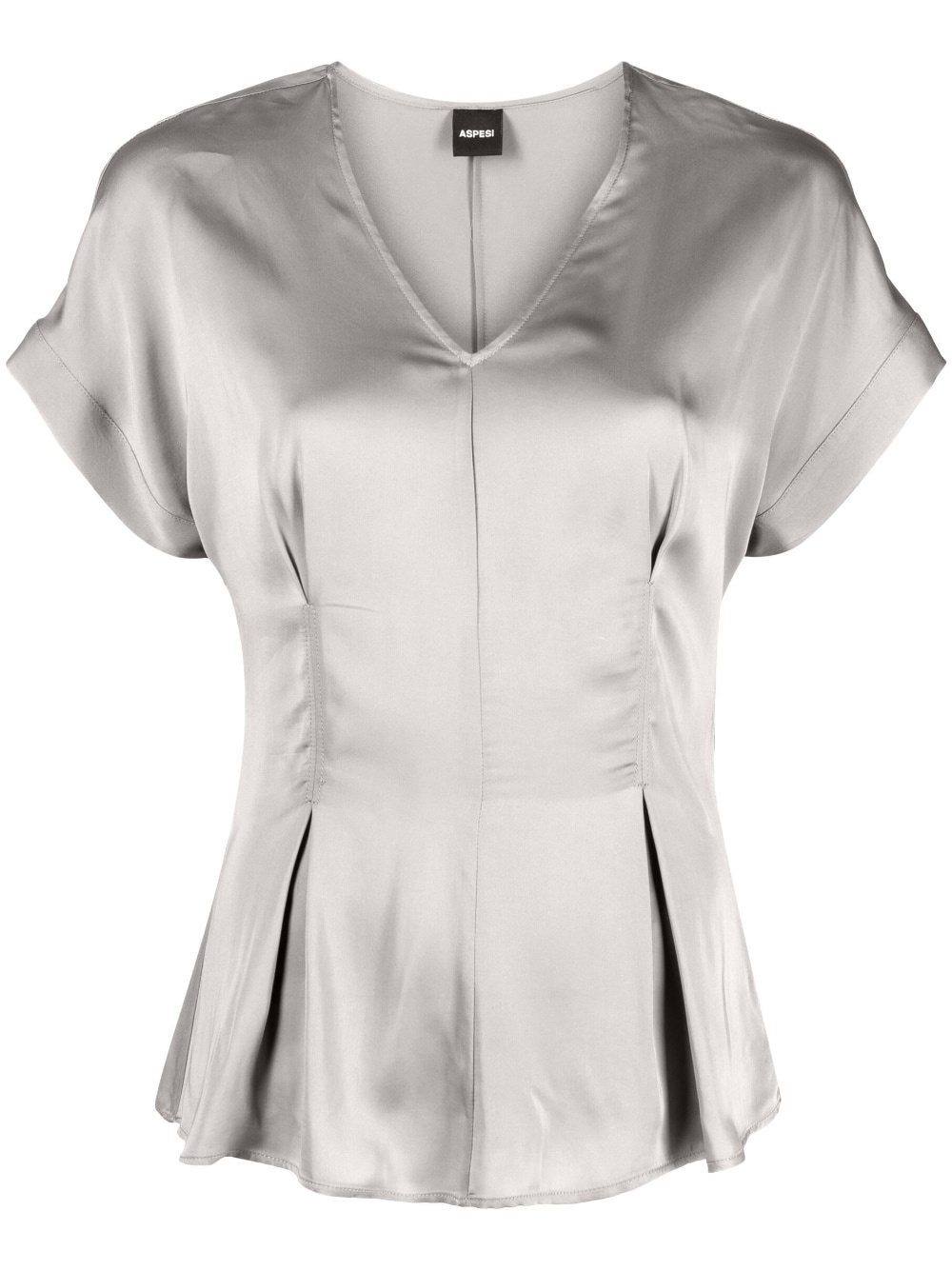 satin-finish flared blouse light grey satin finish pleat detailing slight flare V-neck short sleeves finished edge Made in Italy Composition Viscose 100% SIZE & FIT Model measurements Height 5 ft 11 in(1.8 m) Bust/Chest 31.49 in(80 cm) Hips 35.43 in(90 cm) Waist 24.4 in(62 cm) FittingInformation Designed for a close fit at the chest and waist with a loose fit at the hip Made from a lightweight non-stretch fabric This piece fits true to size – take your usual size Washing instructions Hand Wash