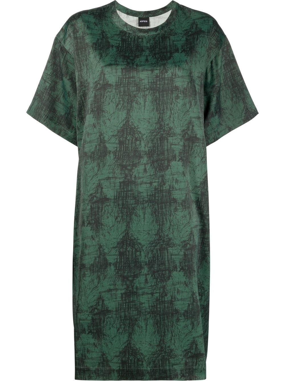 scribble-print T-shirt dress Aspesi recreates a classic silhouette with this mid-length T-shirt dress. Adorned with an all-over scribble print, the Italian label injects a contemporary feel into this relaxed design. Made in Italy Composition Viscose 83%, Wool 17% SIZE & FIT Model measurements Height 5 ft 11 in(1.8 m) Bust/Chest 31.49 in(80 cm) Hips 35.43 in(90 cm) Waist 25.19 in(64 cm) FittingInformation This piece fits true to size. We recommend you get your regular size Cut for a loose fit Made with a mid-weight non-stretch fabric Washing instructions Dry Clean Only