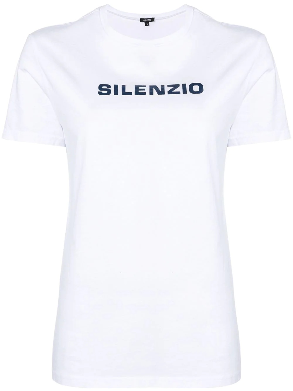 Silenzio print T-shirt White cotton Silenzio print T-shirt from Aspesi featuring a crew neck, short sleeves and a straight hem. Imported Composition Cotton 100% SIZE & FIT Model measurements Height 5 ft 11 in(1.8 m) Bust/Chest 31.49 in(80 cm) Hips 35.82 in(91 cm) Waist 24.8 in(63 cm) Washing instructions Machine Wash