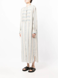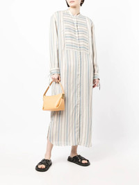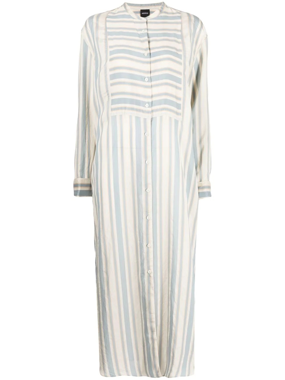 stripe-print shirt dress Highlights - Light blue/white - Vertical stripe print - Band collar - Front button fastening - Long sleeves - Buttoned cuffs - Side slits - Long length Made in Italy Composition Outer: Viscose 80%, Silk 20% SIZE & FIT Model measurements Height 5 ft 10 in(1.79 m) Bust/Chest 31.49 in(80 cm) Hips 35.03 in(89 cm) Waist 24.01 in(61 cm) FittingInformation This piece fits true to size. We recommend you get your regular size Cut for a loose fit Made with a mid-weight non-stretch fabric