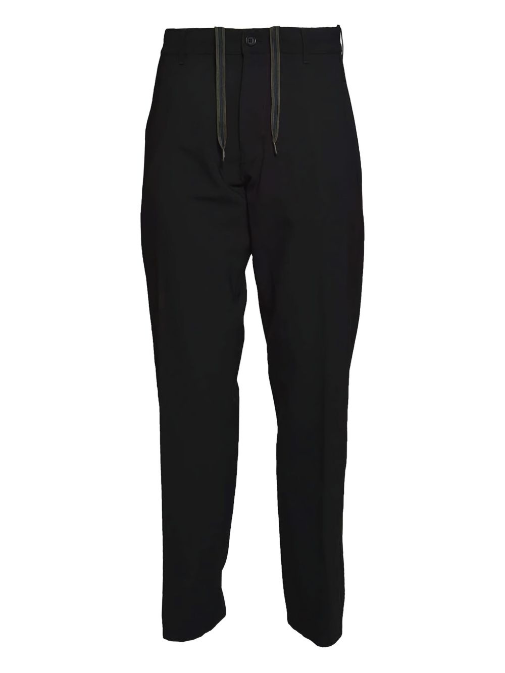 tapered trousers Highlights - Black - Front button and zip fastening - Drawstring waist - Two side slit pockets - Two rear welt pockets Imported Composition Polyester 53%, Virgin Wool 43%, Spandex/Elastane 4%