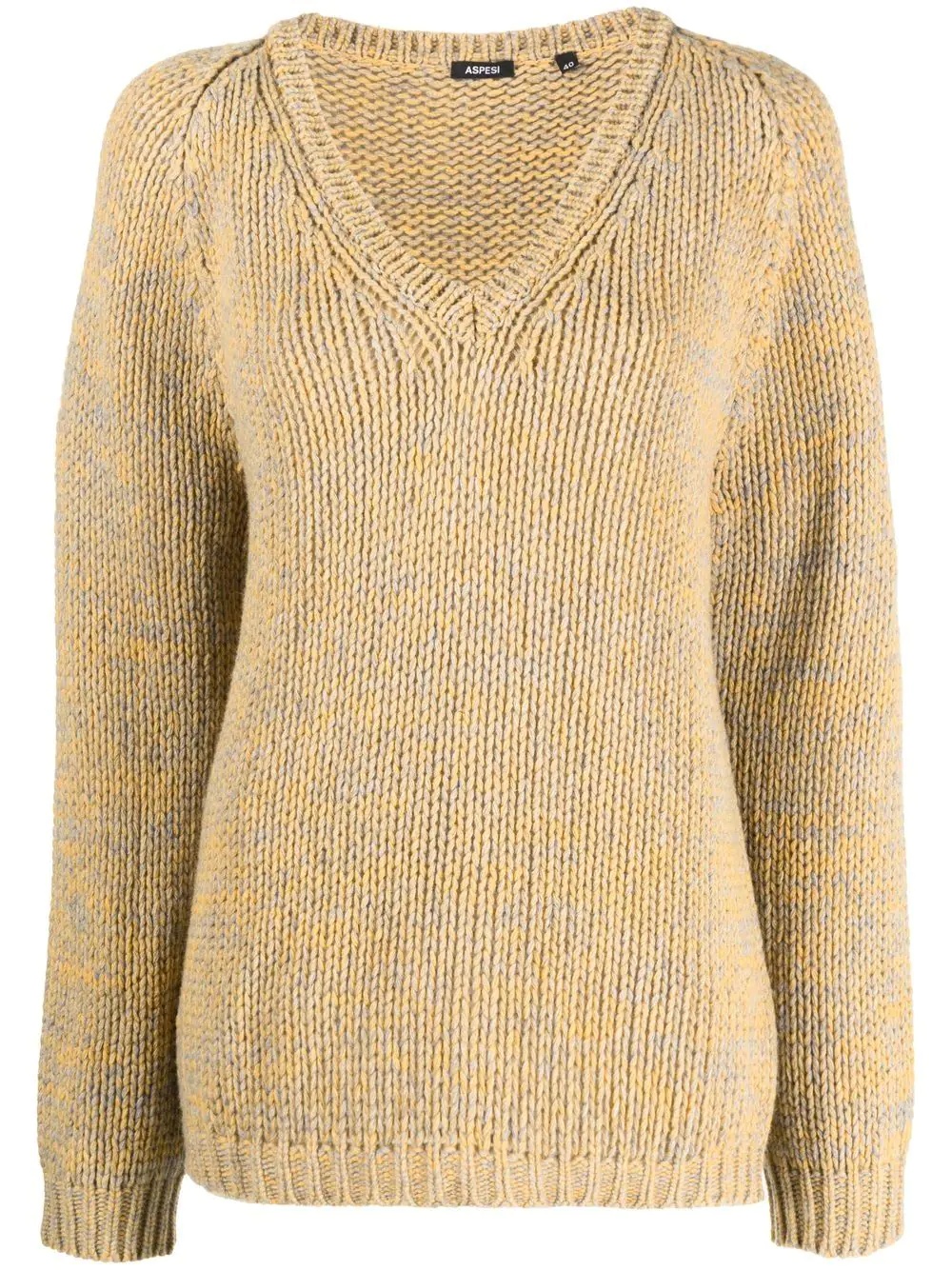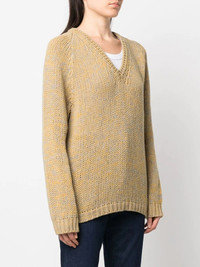 virgin wool V-neck jumper mustard yellow virgin wool V-neck chunky knit long sleeves ribbed trim Made in Italy Composition Virgin Wool 100% SIZE & FIT Model measurements Height 5 ft 10 in(1.78 m) Bust/Chest 31.49 in(80 cm) Hips 36.22 in(92 cm) Waist 25.59 in(65 cm) FittingInformation This piece fits true to size. We recommend you get your regular size Cut for a loose fit Made with a mid-weight fabric Washing instructions Hand Wash