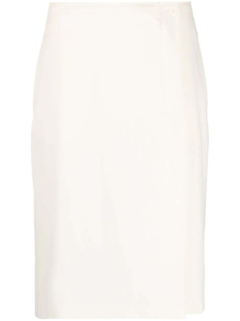 wrap-front midi skirt ivory wraparound style side tie fastening knee-length Made in Italy Composition Outer: Triacetate 70%, Polyester 30% Lining: Cupro 94%, Spandex/Elastane 6% SIZE & FIT Model measurements Height 5 ft 10 in(1.78 m) Bust/Chest 33.07 in(84 cm) Hips 35.82 in(91 cm) Waist 25.98 in(66 cm) FittingInformation This piece fits true to size. We recommend you get your regular size Cut for a slim fit Made with a mid-weight non-stretch fabric Washing instructions Dry Clean Only