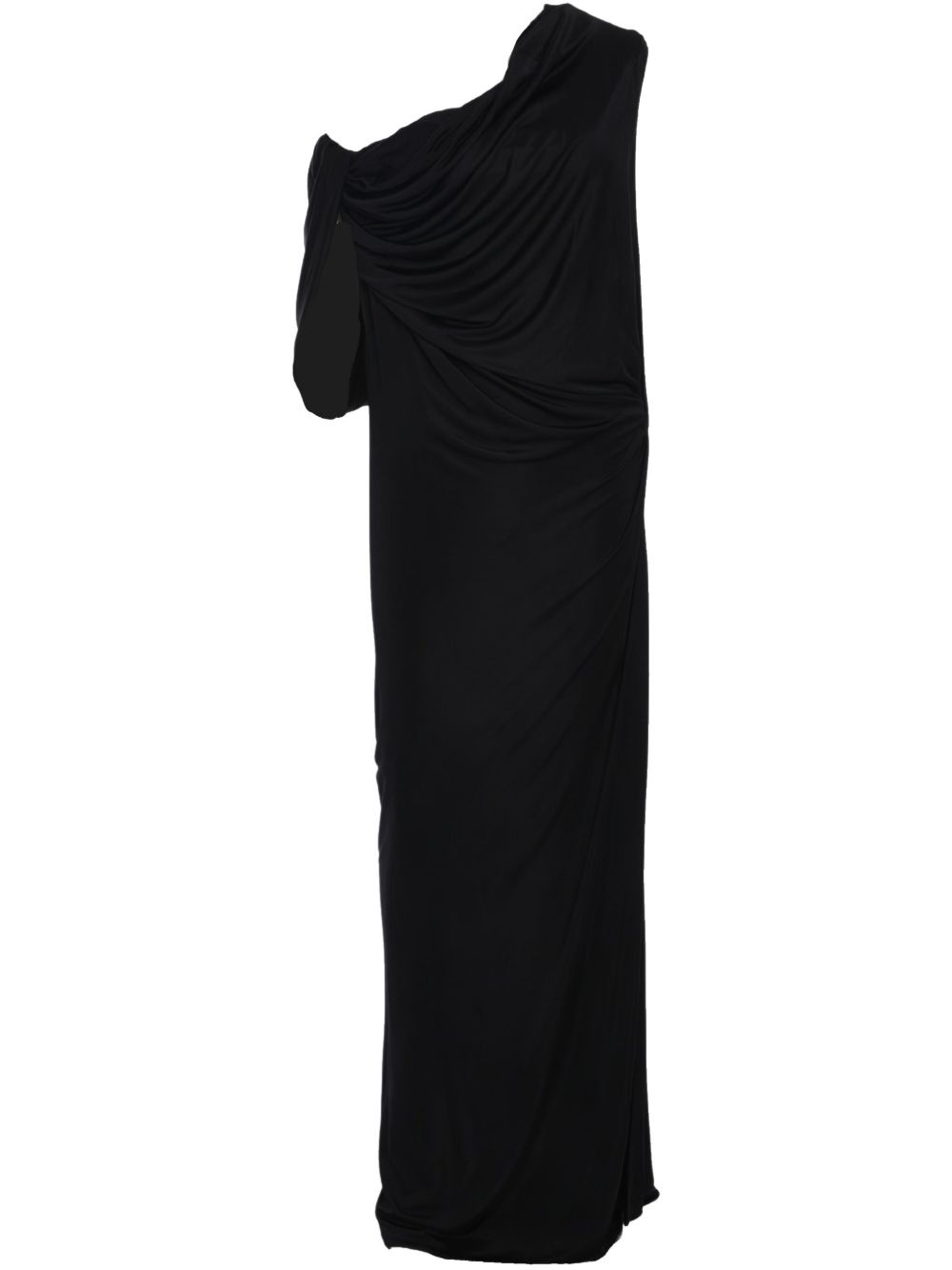 draped gown dress Highlights - Black - Draped design - One-shoulder - Short sleeves - Floor-length Made in France Composition Viscose 95%, Elastane 5%