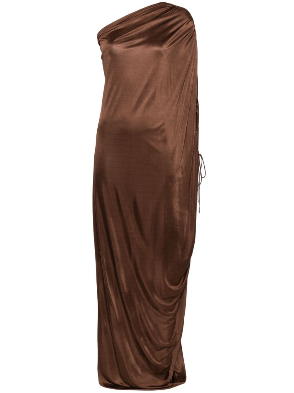 single-sleeve draped dress Highlights - Brown - Stretch-design - Draped design - Asymmetric design - Single sleeve - Straight hem - Long length Made in France Composition Polyester 100%
