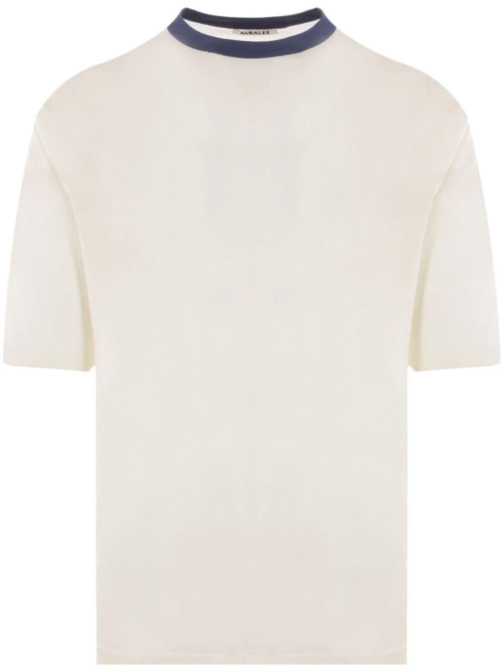 contrasting-collar short-sleeved T-shirt Highlights - Ivory white/navy blue - Wool-silk blend - Contrasting collar - Drop shoulder - Short sleeves - Straight hem Imported Composition Wool 85%, Silk 15%