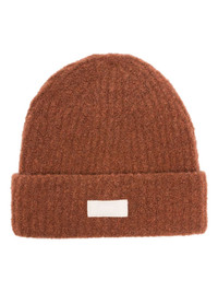 logo-patch beanie hat Highlights - Rust brown - Virgin wool blend - Knitted construction - Ribbed knit - Round crown - Turn-up brim - Logo patch to the front - Unlined - Pull-on style Made in Italy Composition Virgin Wool 77%, Nylon 22%, Elastane 1%