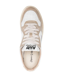 Medalist Low Super Vintage sneakers Autry's Medalist Low sneakers are a re-release of an original '80s design. This white and beige Super Vintage pair takes its name from the distressed finish, which is achieved at the hands of master craftsmen using innovative techniques. They’re made from panels of leather and suede with gold heel counters and signature American flag logos that honour the brand’s roots. Highlights - White, beige, gold-tone - Calf leather - Panelled design - Distressed finish - Metallic effect - Contrasting branded heel counter - Logo patch at the tongue - Logo patch to the side - Perforated toebox - Round toe - French terry lining - Flat rubber sole - Front lace-up fastening Made in Italy Composition Leather 100% SIZE & FIT Measurement HEEL 1.37 in(3.5 cm) Sole height 0.98 in(2.5 cm)