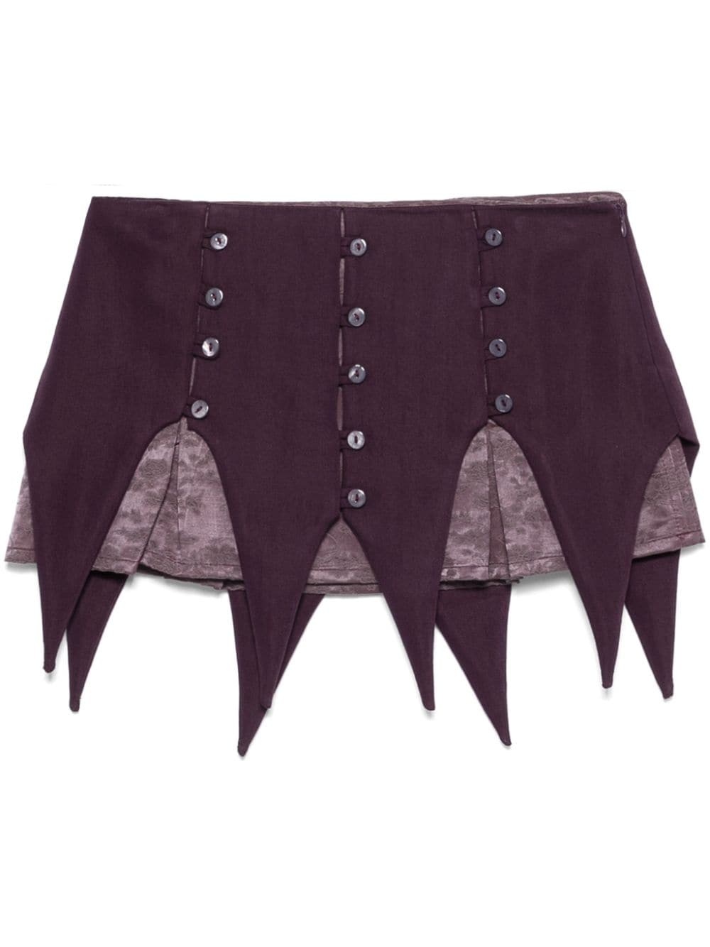 panel mini skirt Highlights - Aubergine - Panelled design - Twill weave - Floral embroidery - Concealed side zip fastening - Mid-rise - Decorative button detailing - Pleat detailing - Sash detail - Asymmetric hem - Unlined - Thigh-length Made in Italy Composition Outer: Polyester 65%, Viscose 35% Lining: Polyester 100% SIZE & FIT Model measurements Height 5 ft 9 in(1.75 m) Bust/Chest 34.64 in(88 cm) Hips 36.61 in(93 cm) Waist 26.37 in(67 cm) FittingInformation This mini-length skirt is intended to be worn low on the hips Slightly short in length; consider your own measurements Made from a midweight non-stretch fabric Washing instructions Dry Clean Only