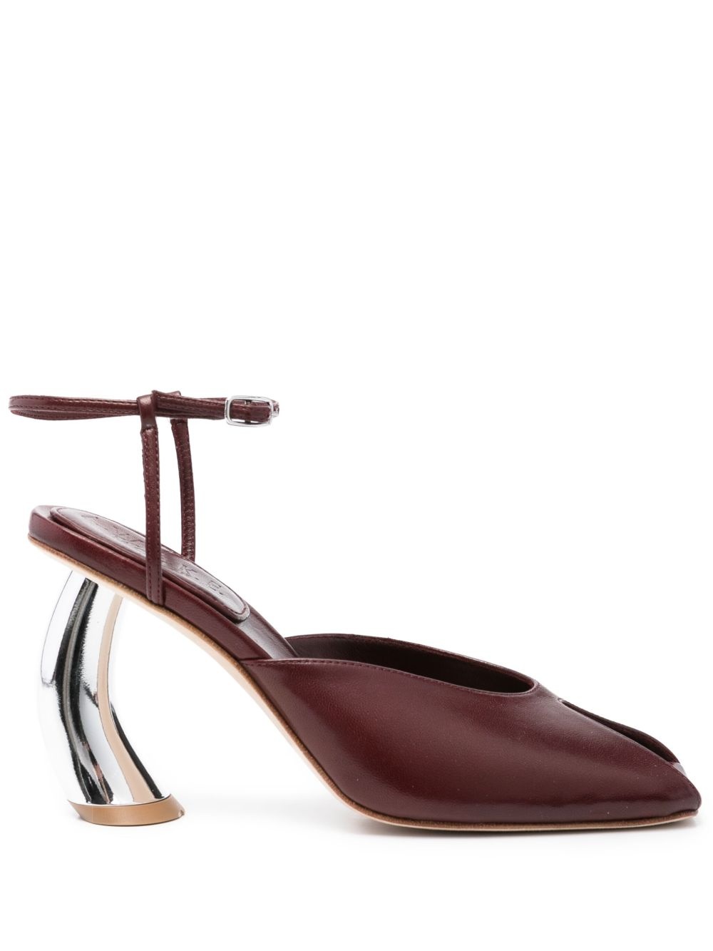 85mm Giustine metallic-heel peep-toe pumps Highlights - Burgundy - Leather upper - Ankle strap - Buckle fastening - Open toe - Curved metallic heel Made in Italy Composition Outer: Calf Leather 100% Lining: Calf Leather 100% Sole: Calf Leather 100% SIZE & FIT Measurement HEEL 3.34 in(8.5 cm)