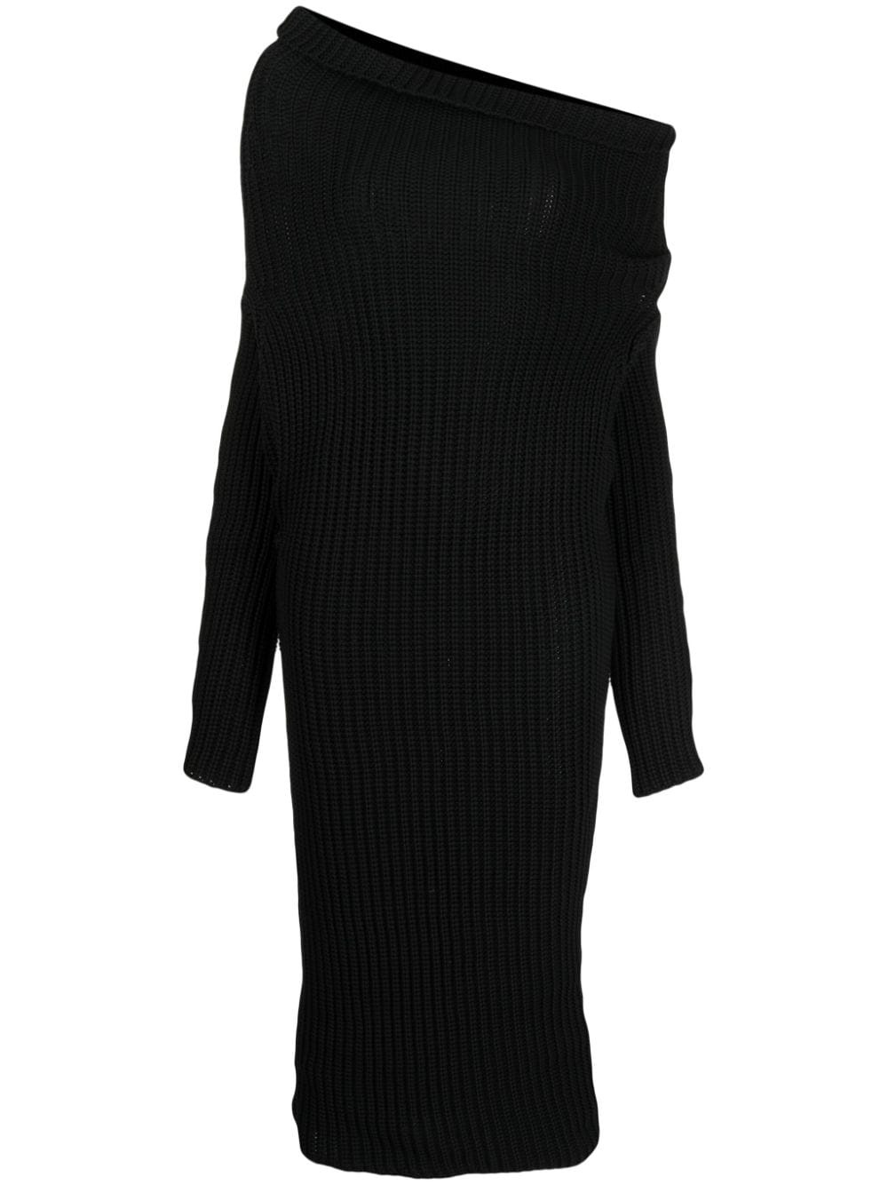 asymmetric wool-blend midi dress Defined by an asymmetric design, this black dress shows A.W.A.K.E. Mode's avant-garde yet versatile style. Crafted from a merino blend, it has a fully ribbed knit construction. Highlights - Black - Merino wool blend - Ribbed knit - Asymmetric neck - Long sleeves - Straight hem Imported Composition Merino 50%, Acrylic 50% SIZE & FIT Model measurements Height 5 ft 10 in(1.78 m) Bust/Chest 30.31 in(77 cm) Hips 34.64 in(88 cm) Waist 24.01 in(61 cm) FittingInformation Designed for a slim fit that sits just away from the body offering a close yet comfortable fit Made with a midweight knit, this piece offers some stretch This piece fits true to size – take your usual size Washing instructions Dry Clean Only