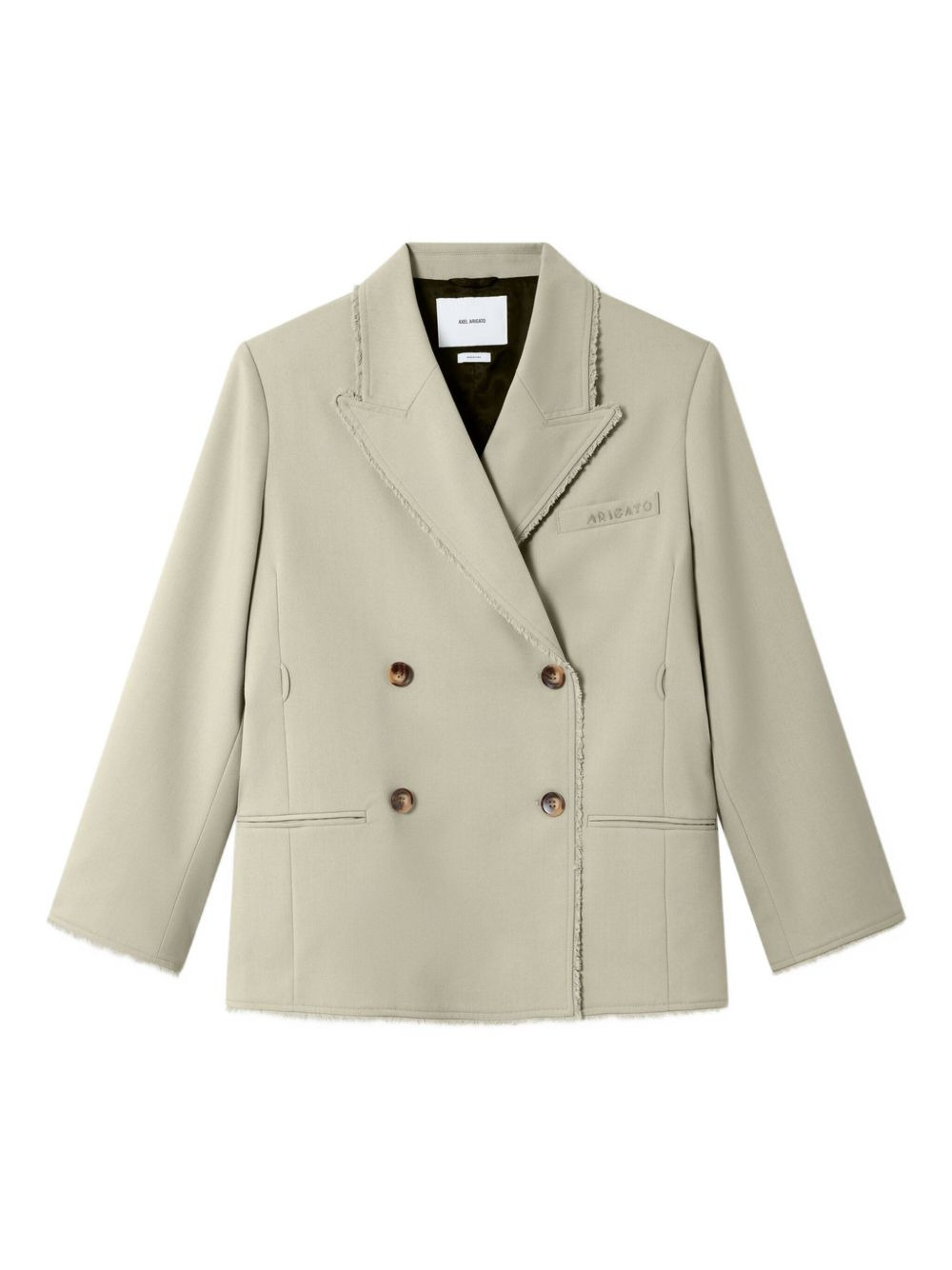 double-breasted blazer Highlights - Dusty green - Frayed edge - Double-breasted fastening - Button fastening - Embroidered logo - Peak lapels Imported Composition Polyester 63%, Wool 35%, Spandex/Elastane 2% Washing instructions Dry Clean Only