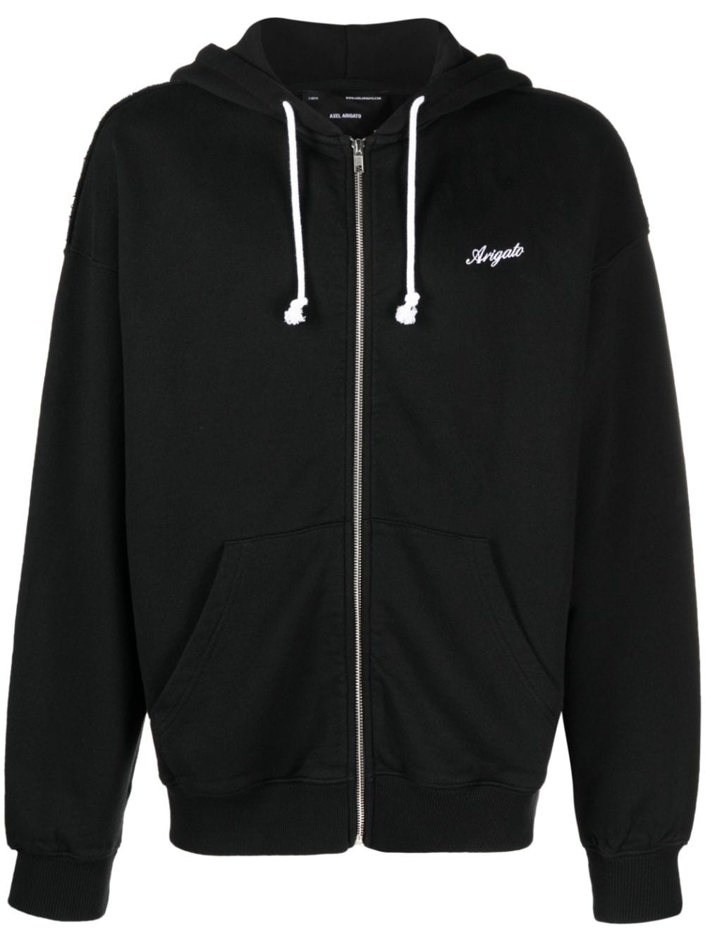 embroidered-logo zip-fastening hoodie Inspired by the Swedish and Japanese philosophy of minimalism, Axel Arigato is known for having a refined design style. Reflected on this zip-fastening hoodie, the garment has an embroidered logo at the chest of the design. Highlights - Black - Embroidered logo at the chest - Drawstring hood - Long sleeves - Front zip fastening Imported Composition Organic Cotton 100% SIZE & FIT Model measurements Height 6 ft 2 in(1.87 m) Bust/Chest 36.41 in(92.5 cm) Hips 37 in(94 cm) Waist 29.52 in(75 cm) FittingInformation Designed to be unstructured, offering a loose fit throughout Made from a midweight non-stretch fabric, this piece offers minimal elasticity when worn This piece fits true to size – take your usual size Washing instructions Machine Wash