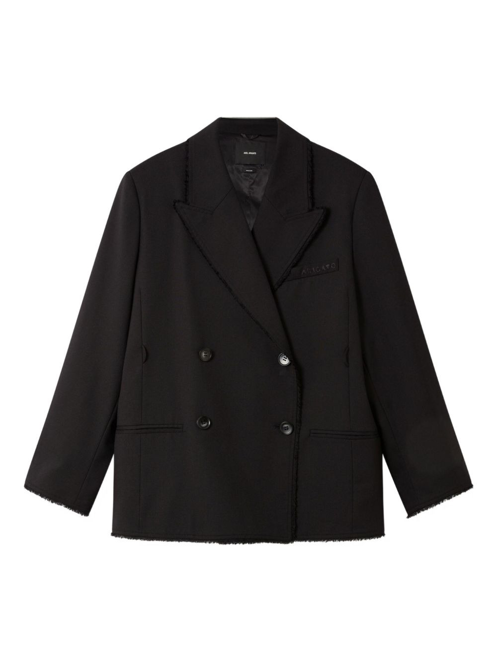 frayed double-breasted blazer Highlights - Black - Frayed edges - Double-breasted fastening - Welt pockets Imported Composition Polyester 63%, Wool 35%, Spandex/Elastane 2% Washing instructions Read Manufacturer Guidelines
