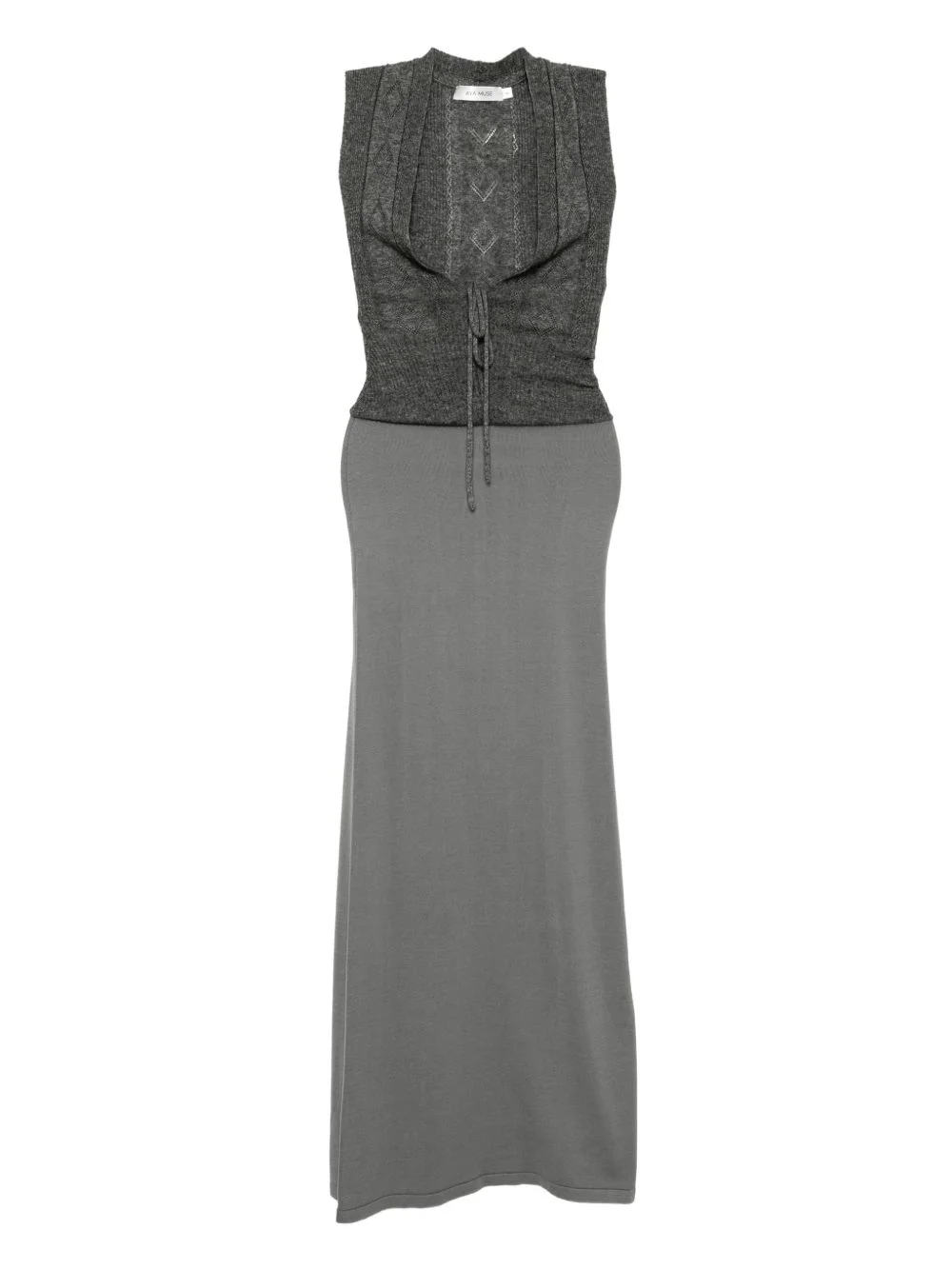 Caius maxi dress Highlights - Smoke grey - Front tie fastening - Off-shoulder - Plunging v-neck - Panelled design Imported Composition Merino 54%, Cashmere 23%, Silk 23% SIZE & FIT Model measurements Height 5 ft 10 in(1.78 m) Bust/Chest 29.52 in(75 cm) Hips 34.25 in(87 cm) Waist 24.4 in(62 cm) FittingInformation Designed for a slim fit that sits just away from the body offering a close yet comfortable fit Made from a midweight non-stretch fabric Washing instructions Dry Clean Only