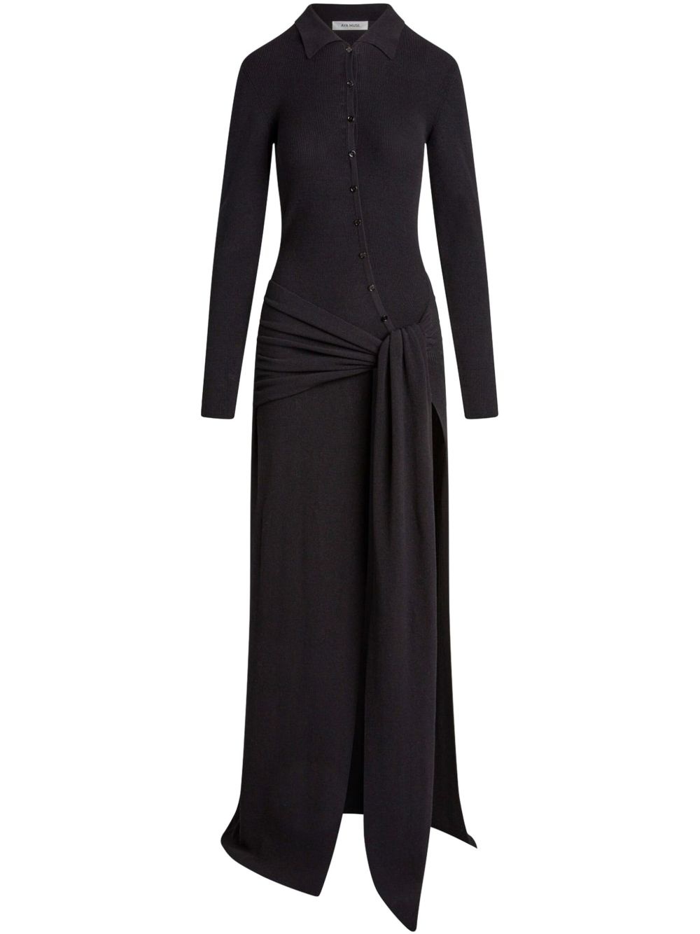 draped-detail maxi dress Highlights - Black - Front button fastening - Long sleeves - Side slit - Floor-length Imported Composition Cotton 75%, Polyester 25%
