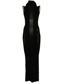 Elara gown Highlights - Black - Boucle construction - Scarf detailing - High neck - Open back - Sleeveless - Slim cut - Side slits - High-low hem Imported Composition Rayon 82%, Polyamide 18% SIZE & FIT Model measurements Height 5 ft 10 in(1.78 m) Bust/Chest 33.07 in(84 cm) Hips 36.61 in(93 cm) Waist 24.8 in(63 cm) FittingInformation Designed for a slim fit that sits just away from the body offering a close yet comfortable fit Made with a lightweight knit, this piece offers some stretch This piece fits true to size – take your usual size Washing instructions Dry Clean Only
