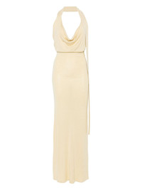 fine-knit maxi dress Highlights - Light yellow - Cowl neck - Scarf detailing - Open back Imported Composition Silk 55%, Viscose 45% SIZE & FIT Model measurements Height 5 ft 11 in(1.8 m) Bust/Chest 32.67 in(83 cm) Hips 35.82 in(91 cm) Waist 25.98 in(66 cm) FittingInformation Designed for a close fit throughout Made with a lightweight knit, this piece offers some stretch